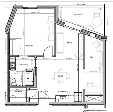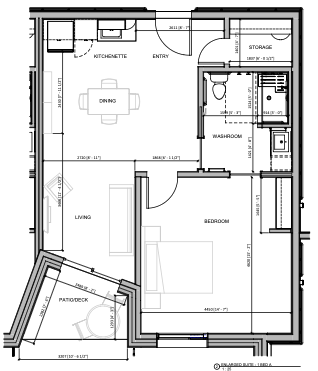 All suites conform to universal design standards with a balcony and a barrier-free bathroom including open living and dining room space, kitchenette, in-suite storage room, and a balcony. 20% of the suites are fully accessible.